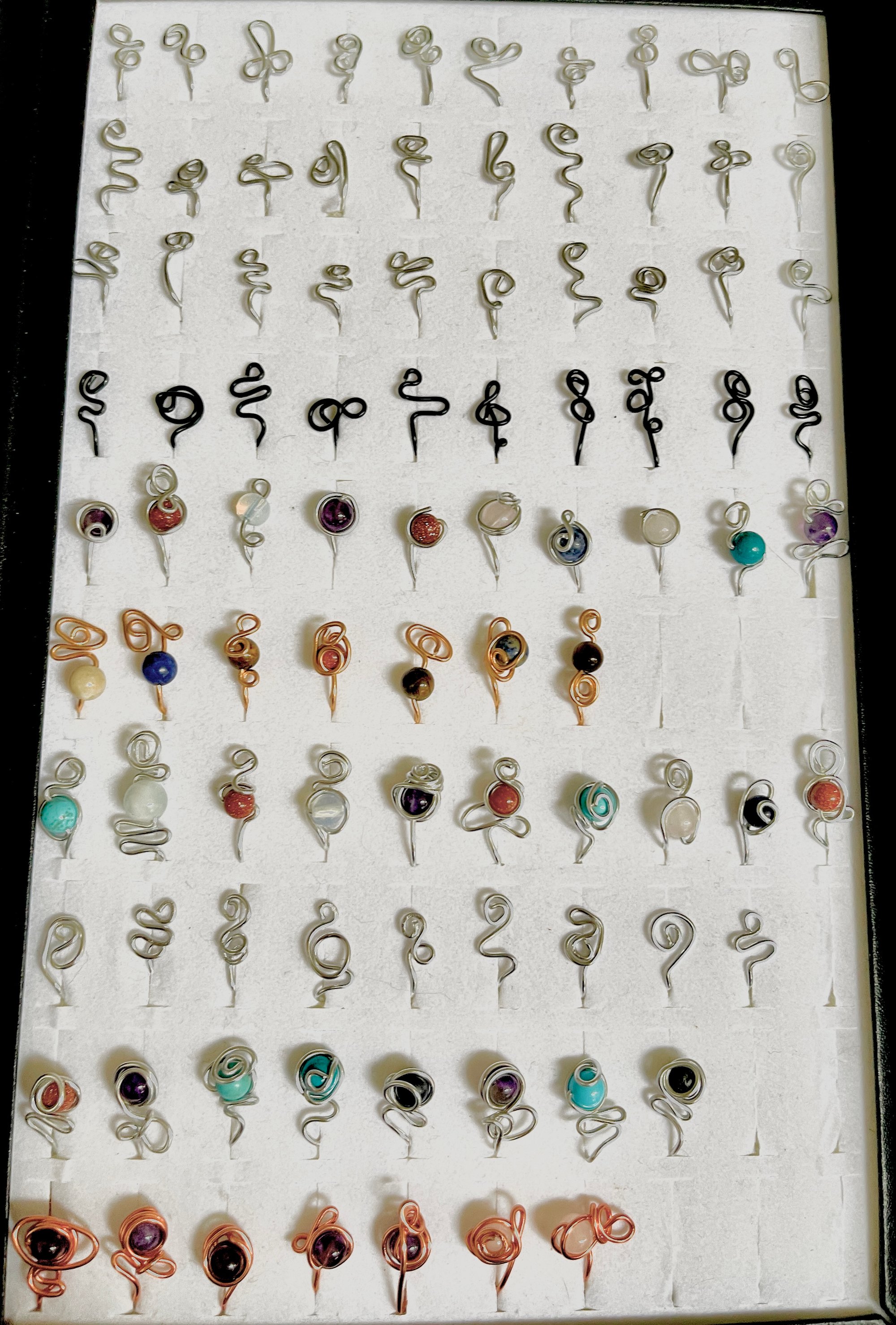 🩶 Silver (Rows 1-3) |🖤 Black (Row 4) | 🩶 Silver + Gemstones (Row 5) | 💛 Yellow Gold + Gemstones (Row 6)| 🩶 Silver + Gemstones (Row 7) | 🩶 Silver (Row 8) | 🩶 Silver + Gemstones (Row 9) | 💛 Copper + Gemstones (Row 10)